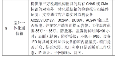 3、招标文件P132,(四)性能指标响应表中,室外一体通信箱要求提供如下资料: