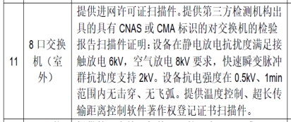 4、招标文件P133,(四)性能指标响应表中,8口交换机(室外)要求提供如下资料: