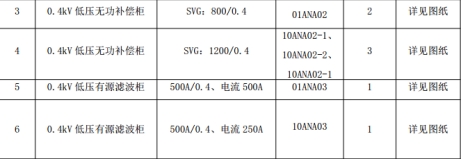 答:01ANA02 柜需做2台,每台补偿容量 400kVar;01ANA03柜有源滤波电流以清单为准;序号 4 需分成三台 10ANA02-1、10ANA02-2、10ANA02-3 每台补偿容量分别为500kVar、500kVar、 200kVar;10ANA03 柜有源滤波电流为250A。