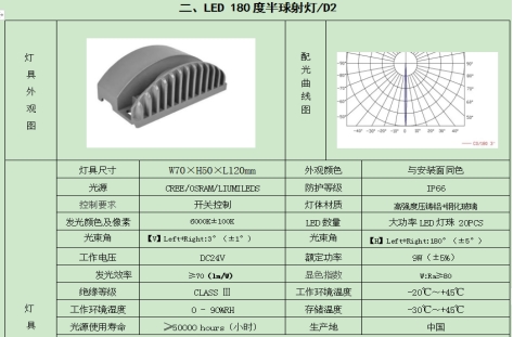 答:此款灯名称修改为LED半球射灯D2,角度修改为:【V】Left+Right:5°(±1°),【H】Left+Right:170°(±10°)