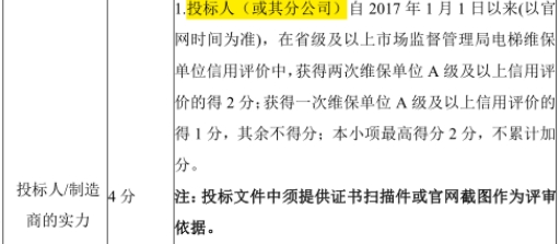 6.招标文件P43页关于制造商实力1.投标人(或其分公司)自2017 年1 月1 日以来(以官网时间为准),在省级及以上市场监督管理局电梯维保单位信用评价中,获得两次维保单位A 级及以上信用评价的得2 分;获得一次维保单位A 级及以上信用评价的得1 分,其余不得分;本小项最高得分2 分,不累计加分。注:投标文件中须提供证书扫描件或官网截图作为评审依据。