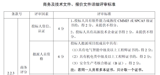 疑问3:招标文件第三章“评标办法”中“商务及技术文件、报价文件详细评审标准”中“拟派人员资格”要求“(1)具有电气智能中级及以上工程师证书的,得2分;”。该证书已被国家取消认定,国务院关于取消和调整一批行政审批项目等事项的决定(国发〔2015〕11号),取消的专业技术人员职业资格许可和认定事项(共计28项,其中准入类4项,水平评价类24项),全国电气智能工程师在取消之列,公告链接:http://www.gov.cn/zhengce/content/2015-03/13/content_9524.htm
