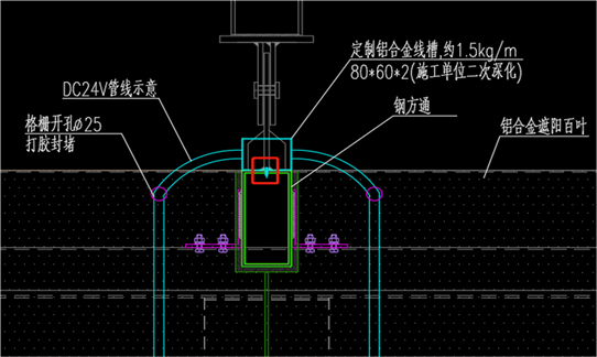 6.节点大样图(三)中,①、灯具名称LED条形灯与清单LED轮廓灯不符,请确认。②、定制铝合金线槽抱箍安装于钢方通上与图示自攻钉安装不符,请确认安装方式。