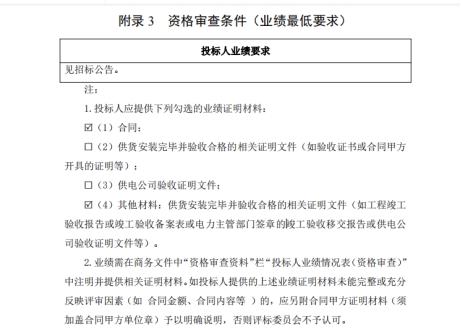 1.招标文件中第25页,附录 3资格审查条件(业绩最低要求)中,合同要求的竣工报告是以供货安装完毕并验收合格的相关证明文件(如工程竣工验收报告或竣工验收备案表或电力主管部门签章的竣工验收移交报告或供电公司验收证明文件等),请问竣工报告中如果不是四方章,是否满足招标文件要求?
