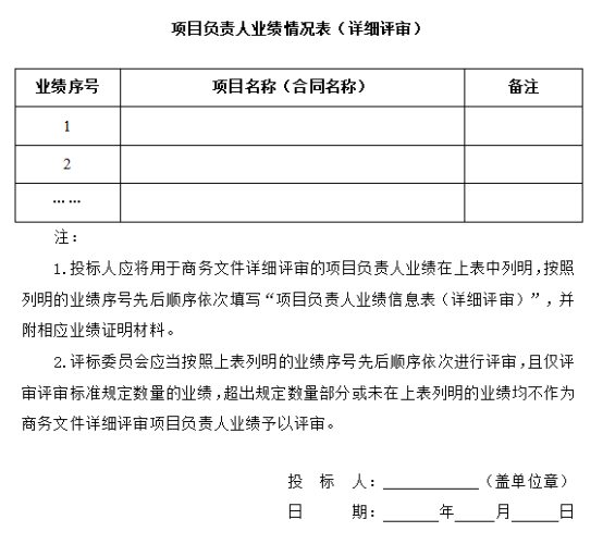 回复:招标文件第三章评标办法-“2.2.2(2)商务文件评分标准”,投标人可在第六章投标文件格式-“七、商务文件详细评审资料”中对照商务文件详细评审要求,自行提供相关资料。投标人可使用投标文件制作工具在本项目“商务文件详细评审资料”节点中对应制作上传。“投标人荣誉”和“技术负责人资格”无固定格式要求,“项目负责人业绩”格式如下: