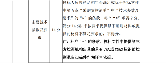 投标人所投产品如完全满足或优于招标文件中第五章“采购货物清单”中“技术参数及要求”的“*”的条款,每个“*”项得2分,满分14分。未按要求提供以下证明材料或提供的材料不满足要求的,不得分。 注:标注“*”的条款,投标文件中提供第三方检测机构出具的具有CMA或CNAS标识的检测报告扫描件作为评审依据。 |