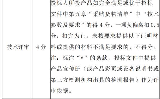 投标人所投产品如完全满足或优于招标文件中第五章“采购货物清单”中“技术参数及要求”的得4分,一项负偏离扣0.5分,扣完为止。未按要求提供以下证明材料或提供的材料不满足要求的,不得分。 注:标注“*”的条款,投标文件中提供产品宣传册(或产品彩页或设备说明书或第三方检测机构出具的检测报告)作为评审依据。 |