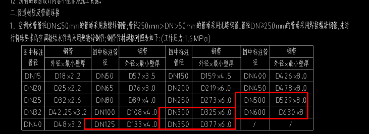 32.招标图纸《P-设计说明及目录_t3_t3_t3》及《D2-M-说明、目录、图例、设备表》中循环冷却水和空调水管壁厚要求不一致,而招标清单中并未将冷却水管道及冷冻水管道分类统计。请问管道厚度具体以哪处图纸描述为准?