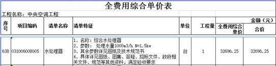 与全费用综合单价表(控制价)第638项“水处理器”(如下截图),不符合,请明确是否以“全费用综合单价表(控制价)”为准?