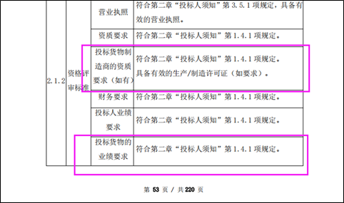 答复:(1)投标人须知第1.4.1项未对投标货物制造商的资质提出要求,无需提供。(2)投标人须知第1.4.1项未对投标货物的业绩提出要求,无需提供。