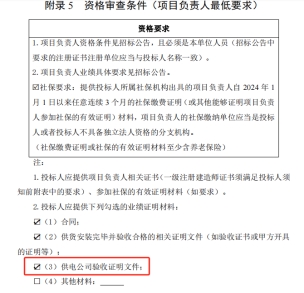 答:如业绩项目无需供电公司进行验收,投标文件中无需提供“供电公司验收证明文件”,但需同时提供业绩合同甲方出具的“无需供电公司进行验收”的证明材料,证明材料需加盖业绩合同甲方公章,否则不予认可。