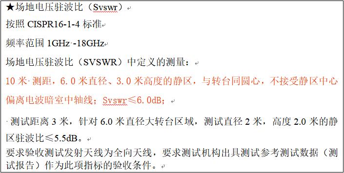 答复:按招标文件执行。场地电压驻波比(SVSWR):大型产品测试需要较大静区的,3米测距2米静区不够;且该参数场地是可以计量的。