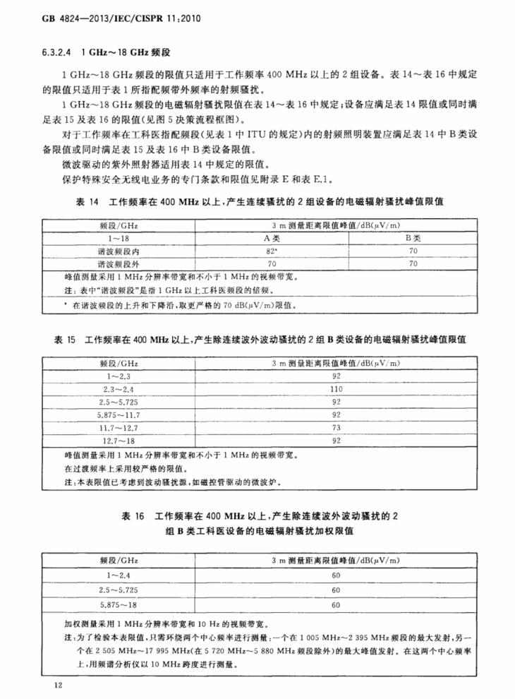 比如:GB4824-工科医产品电磁兼容标准第12页,参考6.3.2.4条,在1GHz-18GHz频段内,表14,表15,表16内的限值要求,都是在3m的测试距离下的电磁辐射骚扰峰值限值。并无10m测试距离的限值。
