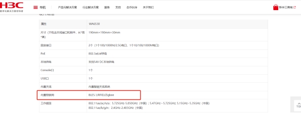 “1.采用三频6流设计,支持802.11ax模式,支持MU-MIMO;4.内置智能天线,支持内置物联网BLE5.1/RFID/Zigbee,提供官网截图证明;