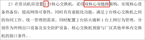 招标清单中网络的命名为办公网、生产网、设备网。而技术规范书中,对于网络架构的设计描述混乱,包含了产业园区内网、产业园区外网、智能化设备网、厂区办公网、厂区生产网等。出现1台核心交换机,双核心双链路的矛盾描述。