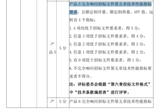 建议:多联机空调外机产品5和产品6“完全响应招标文件第五章技术性能指标要求,且额定制冷量、额定制热量、APF值、运转音、参考功率、室外机总高度6个指标: