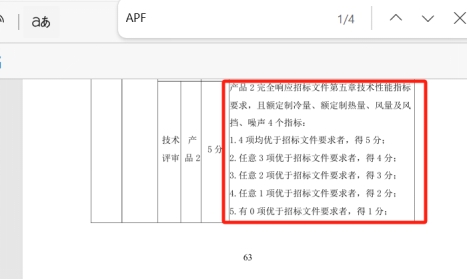 产品5完全响应招标文件第五章技术性能指标要求,且APF值、运转音2个指标: