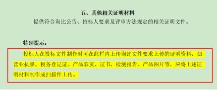2.其他相关证明材料中,特别提示:投标人在投标文件制作时可在此栏内上传询比文件要求上传的证明资料,如营业执照、税务登记证、产品彩页、证书、检测报告、产品图片等,应将上述证明材料制作成扫描件上传。