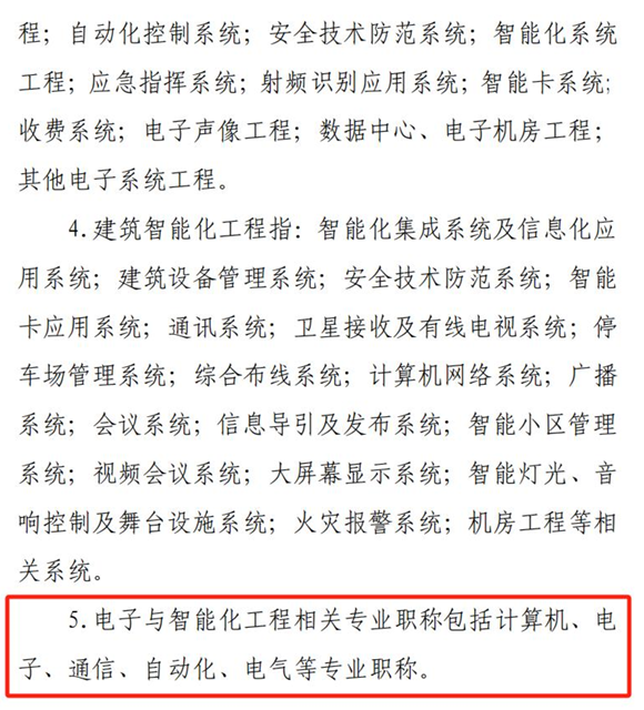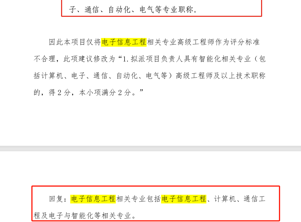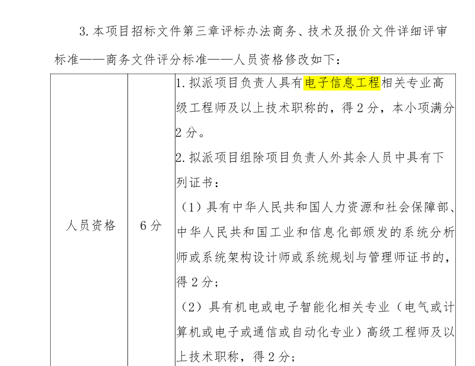 1、答疑文件明确了人员资格修改如下“1.拟派项目负责人具有电子信息工程相关专业高级工程师及以上技术职称的,得2分,本小项满分 2分。”,且后续答疑回复显示“电子信息工程相关专业包括电子信息工程、计算机、通信工程及电子与智能化等相关专业。”,《建筑业企业资质标准》中对电子与智能化工程资质标准人员专业有明确要求,机电工程、通信与广电工程专业和电子与智能化相关专业,同时也给出电子与智能化相关专业指:计算机、电子、自动化、电气等专业职称。具体如下: