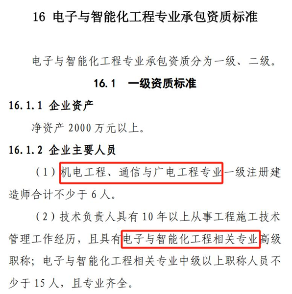 2、答疑文件明确了人员资格修改如下“1.拟派项目负责人具有电子信息工程相关专业高级工程师及以上技术职称的,得2分,本小项满分 2分。”,且后续答疑回复显示“电子信息工程相关专业包括电子信息工程、计算机、通信工 程及电子与智能化等相关专业。”,《建筑业企业资质标准》中对电子与智能化工程资质标准人员专业有明确要求,机电工程、通信与广电工程专业和电子与智能化相关专业。具体如下: