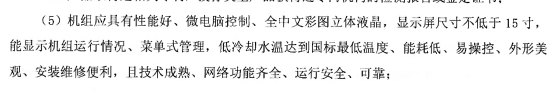 (2)5.1总体要求中“(5)机组应具有性能好、微电脑控制、全中文彩图立体液晶,显示屏尺寸不低于15寸。”建议修改为:“机组显示屏10寸,具有完善的性能和显示、操作功能。”