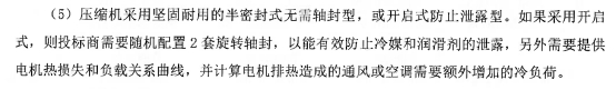 疑问:开启式机组因其可适应冷却水温度宽,故更加适合工况多变、全年运行的场合,轴封的可靠性已经市场充分验证,只是机组的一个部件。工厂提供整机质保。机房自然通风即可满足机组运行环境。建议修改为:“压缩机采用坚固耐用的半密封式无需轴封型,或开启式防止泄露型。如果采用开启式,轴封质保期应与整机相同。”