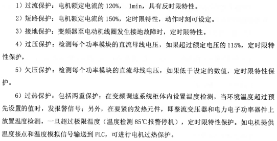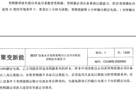 疑问:变频器具备一定的超载能力,能实现1分钟内超载105%额定电流的要求。因为变频器是为机组的变频所服务的,机组已设置完善的保护系统,如果长时间变频器超载运行,机组控制系统会报警。制冷机组是整体选型设备,并无单独变频器的样本。建议修改为:“变频器须按负载功率选用重载型变频器。变频器必须具备重载过载能力,即在变频器柜内温度45度的环境条件下,要求以5分钟为周期,变频器能够4分钟输出额定电流,1分钟输出105%额定电流。在上述条件下变频器额定输出电流如果有降容的,为避免降容后的输出电流小于电机额定电流,变频器必须放大选型直至满足该要求。”
