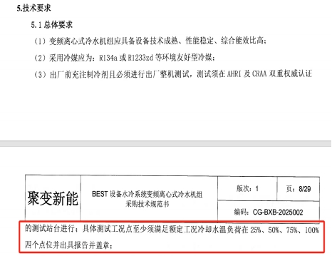 补充说明:BEST设备水冷系统变频离心式冷水机组采购技术规范书第5.1(3)条:出厂前充注制冷剂且必须进行出厂整机测试,测试台须满足AHRI及GMPI双重权威认证;具体测试工况点至少须满足额定工况冷却水温负荷在25%、50%、75%、100%四个点位并出具报告并盖章。此条为必须满足项,投标人须在投标文件中承诺并盖章。
