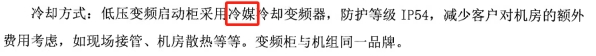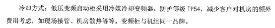 疑问:低压变频柜的冷却方式有冷却水冷却,冷媒冷却,防护等级以IP22为主。主流品牌使用的并不统一,为避免排除潜在品牌参与,建议修改为:“低压变频启动柜采用冷媒冷却或冷却水冷却变频器,防护等级不低于IP22,减少客户对机房的额外费用考虑,如现场接管、机房散热等等。变频柜与机组同一品牌。”