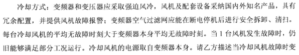 21.招标采购技术规范书中“5.3.3 启动柜-(2)高压变频启动柜-冷却方式:当1台风机发生故障时,仍旧能够满足部分工况运行”。疑问:当高压变频启动柜部分散热风机出现故障时,机组不应正常运行,如部分风机出现故障机组仍旧运行,易导致变频器以及主机出现严重故障。此条技术要求不适用,建议删除。
