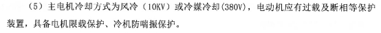疑问:主电机冷却方式业内主流一共两种,风冷和冷媒冷却,和电压没有关系。建议修改为:“主电机冷却方式为风冷或冷媒冷却,电动机应有过载及断相等保护装置,具备电机限载保护、冷机防喘振保护。”