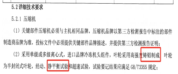 建议:建议此处改为(2)采用单级或多级离心式,国际知名品牌的冷冻机头组件,