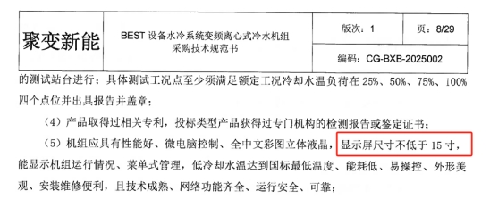 疑问:根据市场调查市场上冷水机组显示屏一般都在12寸左右,此处要求不低于15寸为市场个别品牌所有;