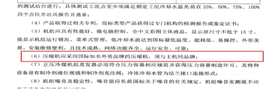 疑问:此处要求机组压缩机采用外资品牌的压缩机,具有明显倾向性,如今,国产品牌的冷水机组在性能上已达到或接近国际先进水平,也能自己生产压缩机,部分技术甚至处于国际领先地位;