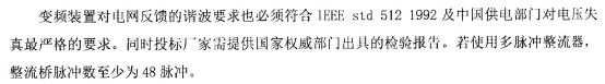 疑问:制冷设备是整体选型设备,可以提供制冷主机整机的第三方试验报告,无法提供单独变频装置的报告。建议修改为:“变频装置对电网反馈的谐波要求也必须符合IEEE std 512 1992及中国供电部门对电压失真最严格的要求。若使用多脉冲整流器,整流桥脉冲数至少为48脉冲。”