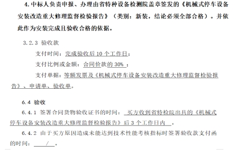 1.单个合同机械立体停车位供货及安装金额不低于190万元;