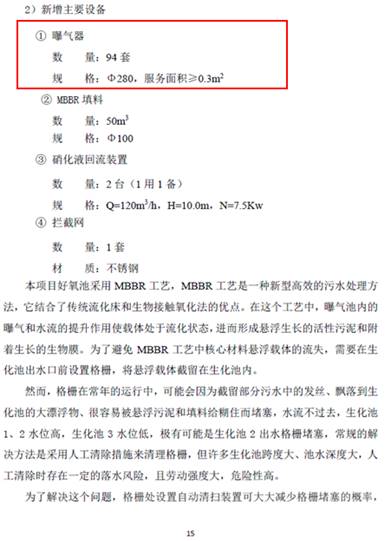 答复:新增曝气池采用曝气器,新增94套φ280曝气器,具体施工位置由设计单位联系单确认后再行施工,原曝气池按原系统进行修缮。以上内容涉及费用清单不单独列项,由投标人在投标报价中综合考虑,中标后不予调整。
