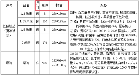 答:“丝绵被芯”及“浴袍”的“具体清单”尺寸/单位/数量名称应为