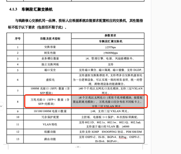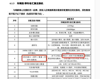 10、招标文件《02合肥市轨道交通6号线一期、7号线一期、S1线工程OA基础网络系统集成及安装招标文件——第二册专用技术需求》P14页4.1.2线路核心交换机参数“≥16个万兆以太网光口(配置4个10KM万兆单模模块,4个40KM万兆单模模块,4个80KM万兆单模模块),支持三层VXLAN网关”。