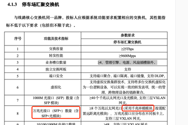 答复:2.4.3停车场网络设计“停车场网络区域配置1台汇聚层交换机,各单体内的接入交换机采用千兆光纤接入”,参照补疑1最新用户需求书。
