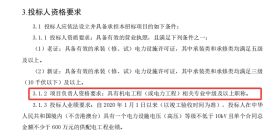 资格审查中:项目负责人资格要求为具有机电(或电力工程)相关专业中级及以上职称不合理。