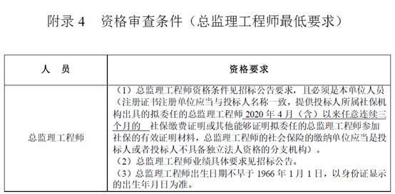 4.招标文件P23附录4“资格审查条件(总监理工程师最低要求)”第(3)项要求总监理工程师出生日期不早于1966年1月1日,而注册监理工程师执业年限国家相关规定为65周岁,且能胜任轨道交通总监岗位需要多年的监理经验积累,本工程对总监业绩经验要求较高,此条件设置是否合理?