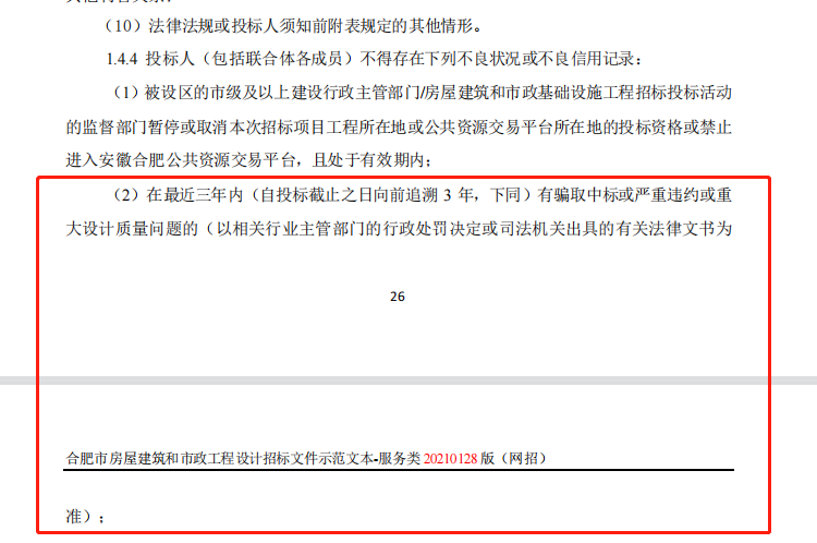 答:招标文件中约定:“1.4.4 投标人(包括联合体各成员)不得存在下列不良状况或不良信用记录:(2)在最近三年内(自投标截止之日向前追溯3年,下同)有骗取中标或严重违约或重大设计质量问题的(以相关行业主管部门的行政处罚决定或司法机关出具的有关法律文书为准)”,具体以评标委员会评审结果为准。