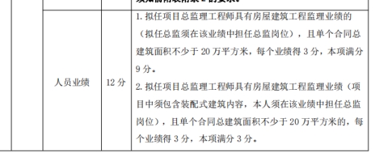 5.招标文件第48页投标人类似项目业绩中要求:自2017年1月1日以来(以竣工验收时间为准),投标人具有房屋建筑工程监理业绩(项目中须包含装配式结构),且单个合同总建筑面积不少于20万平方米的,每个业绩得3分,本项满分6分。