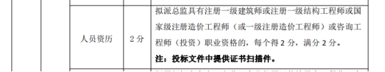 7.招标文件第51页人员资历中要求:拟派总监具有注册一级建筑师或注册一级结构工程师或国家级注册造价工程师(或一级注册造价工程师)或咨询工程师(投资)职业资格的,每个得2分,满分2分。