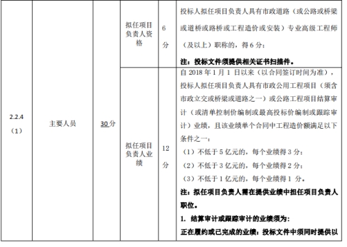 本招标文件第三章 评标办法 拟任项目负责人业绩“自 2018年1月1日以来(以合同签订时间为准), 投标人拟任项目负责人具有市政公用工程项目(须含市政立交或桥梁或道路之一)或公路工程项目结算审计(或清单控制价编制或最高投标价编制或跟踪审计)业绩,且该业绩单个合同中工程造价额满足以下条件之一:(1)不低于 5 亿元的,每个业绩得 3 分;(2)不低于 3 亿元的,每个业绩得 2 分; (3)不低于 1 亿元的,每个业绩得 1 分。” 现提出疑问如下: