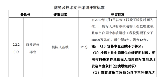 2.第三章评标办法中“投标人业绩:自2017年1月1日以来(以竣工验收时间为准),投标人具有市政道桥工程监理业绩,且单个合同中市政道桥工程投资额不少于40000万元的,每个得3分,满分12分”