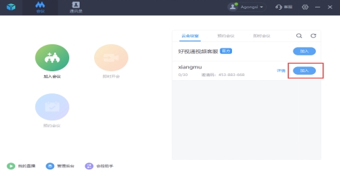 2、进入会议:登录完成后可以看到右侧相应的会议室,点击“加入”。
