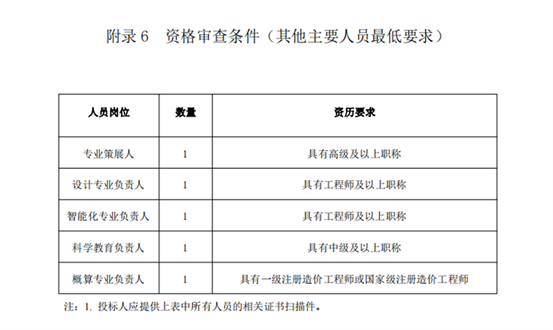 1. 招标文件22页,附录 6资格审查条件(其他主要人员最低要求)。请问:此处人员岗位为企业的设立的岗位,是否提供“资历要求”的相关证书即可?是否符合资格审查条件人员最低要求?因人员岗位中的科学教育负责人,专业策展人,暂无相关专业职称,类似科学教育一般由高校,学校才会具备。