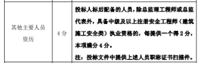 投标人标后配备的人员,除总监理工程师或总监代表外,具备中级及以上注册安全工程师(建筑施工安全类)执业资格的,每提供一个得 2 分,本项满分 4 分。